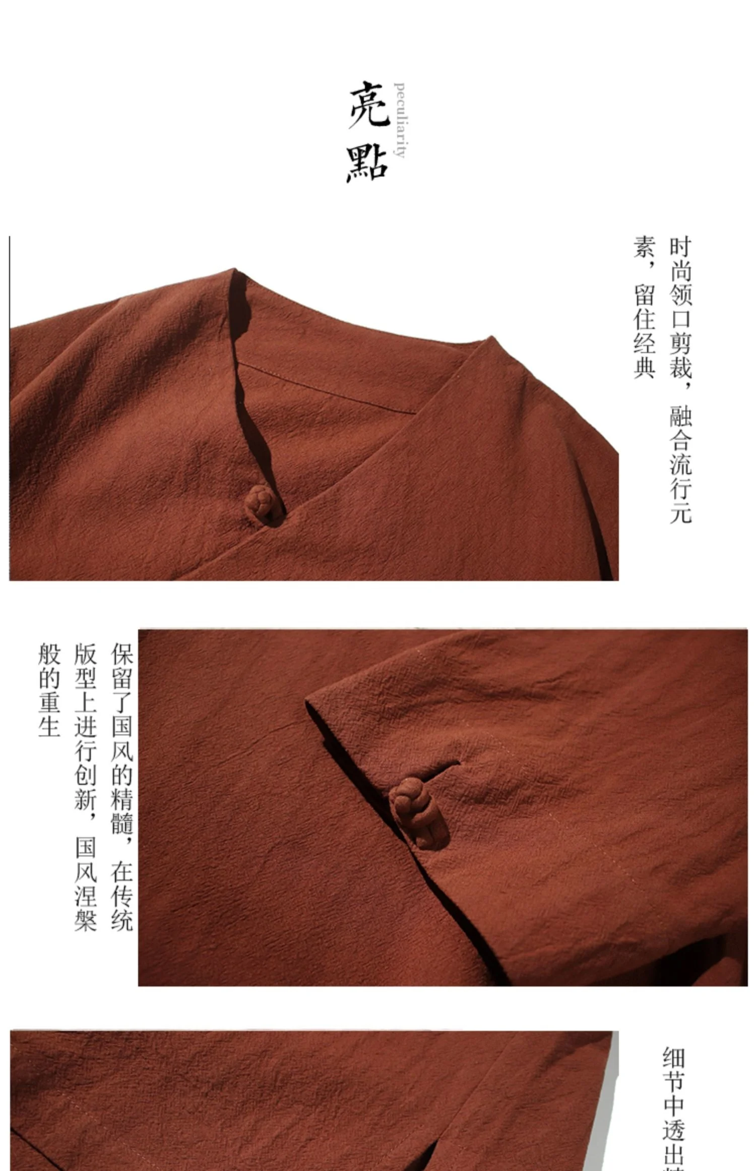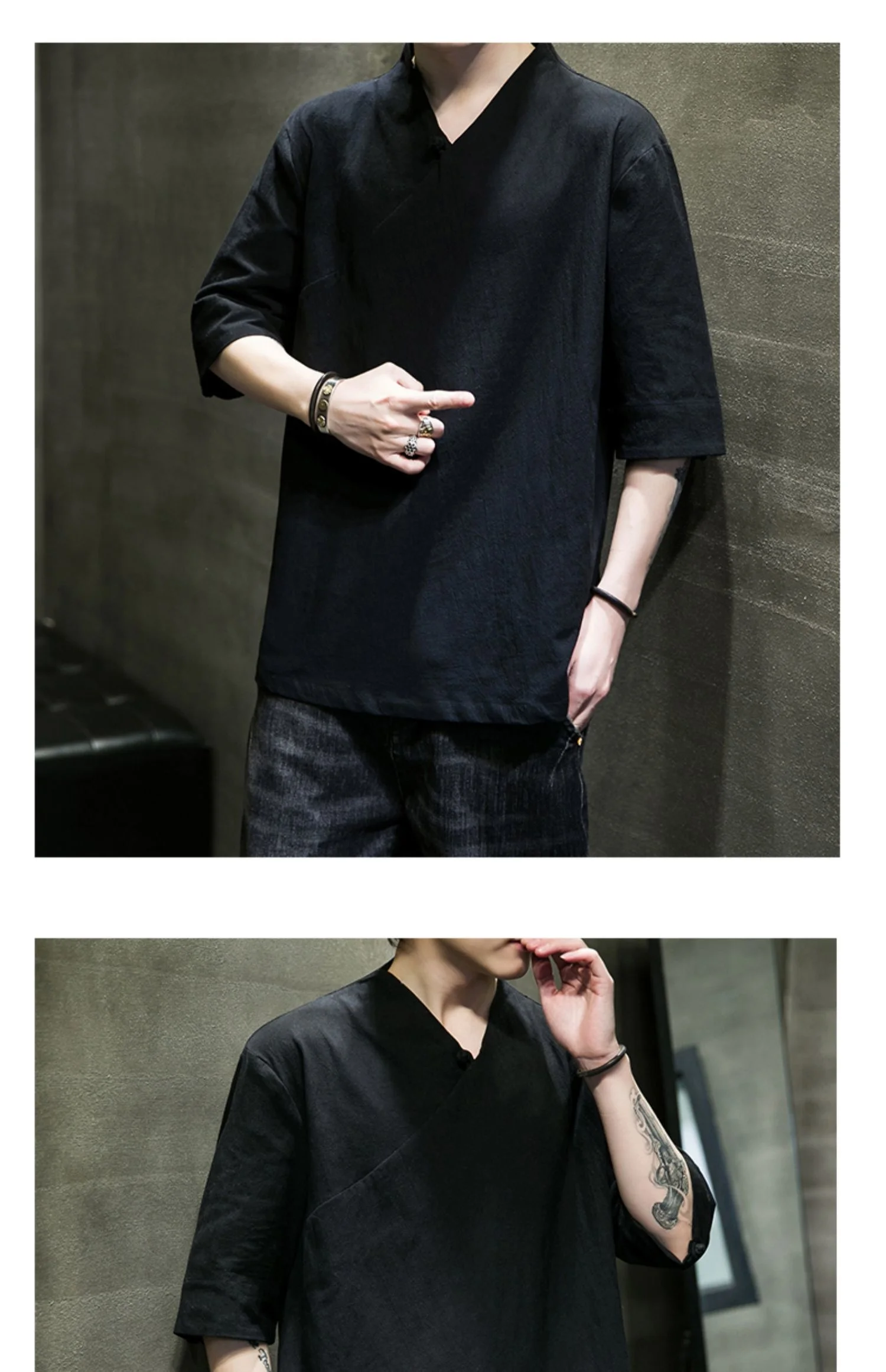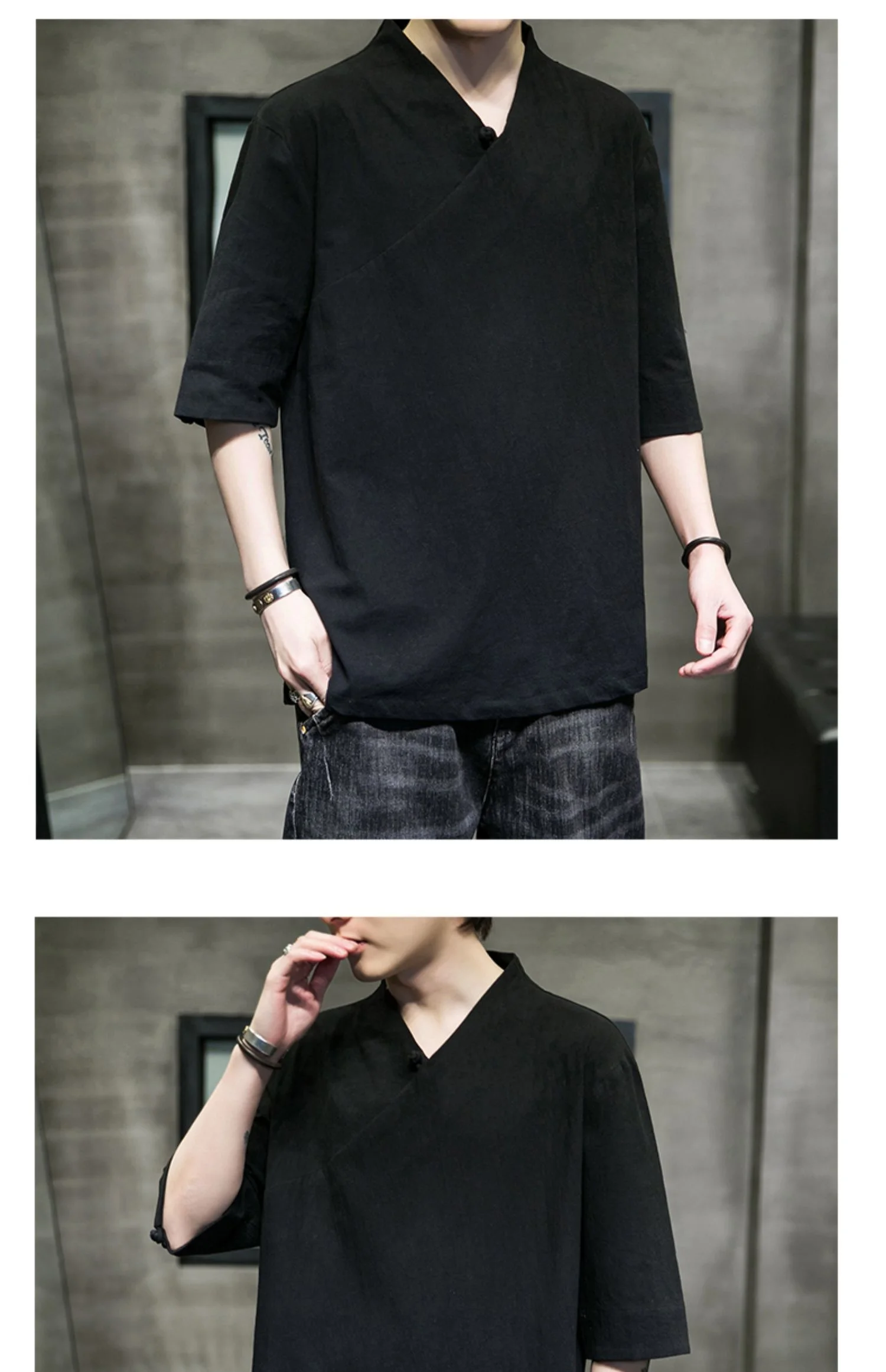 Chinese Traditional Dress Retro V-Neck T-Shirt Men Clothing 2022 Summer Plus Size Five-Point Sleeve Hanfu Black Thin Linen Top