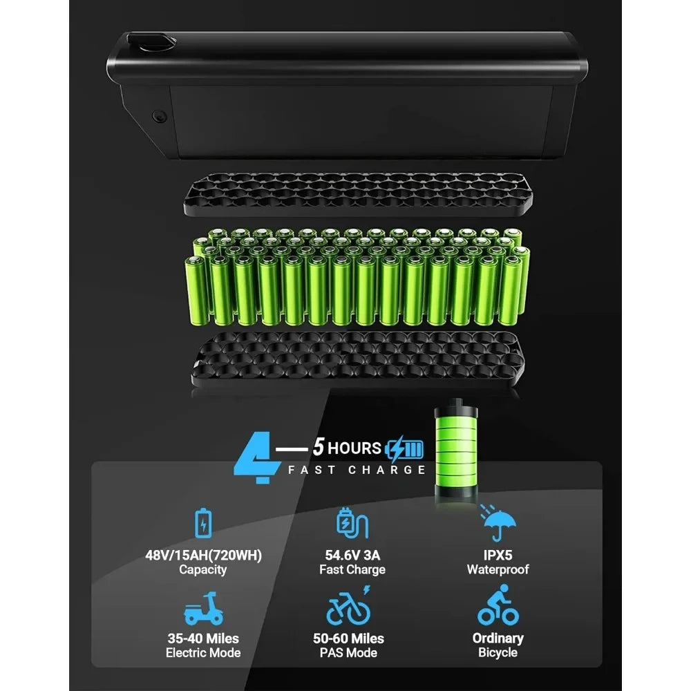 48V/15AH (720WH) LITHIUM-BATTERY: Travel up to 60 miles in pedal assist mode. With Cruise Control and twist grip throttle, you can easily control your riding speed. The electric bike for adults are equipped with the BMS system that provides 14 types of protection, making our battery safer and more cycle life. A 4-5 hour, 3A fast charge keeps you on the road.