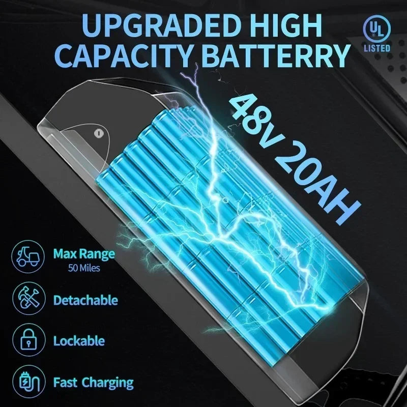 【1000W high-speed motor & removable 48V 20Ah battery】This electric bike is a perfect choice for daily commutes and mountain adventures. The battery can be charged within 6-8 hours, and the bike can reach a top speed of 30 miles/hour, providing a thrilling ride experience. Upgrade to our electric motorcycle for adults now and enjoy the convenience and excitement of this amazing ride!