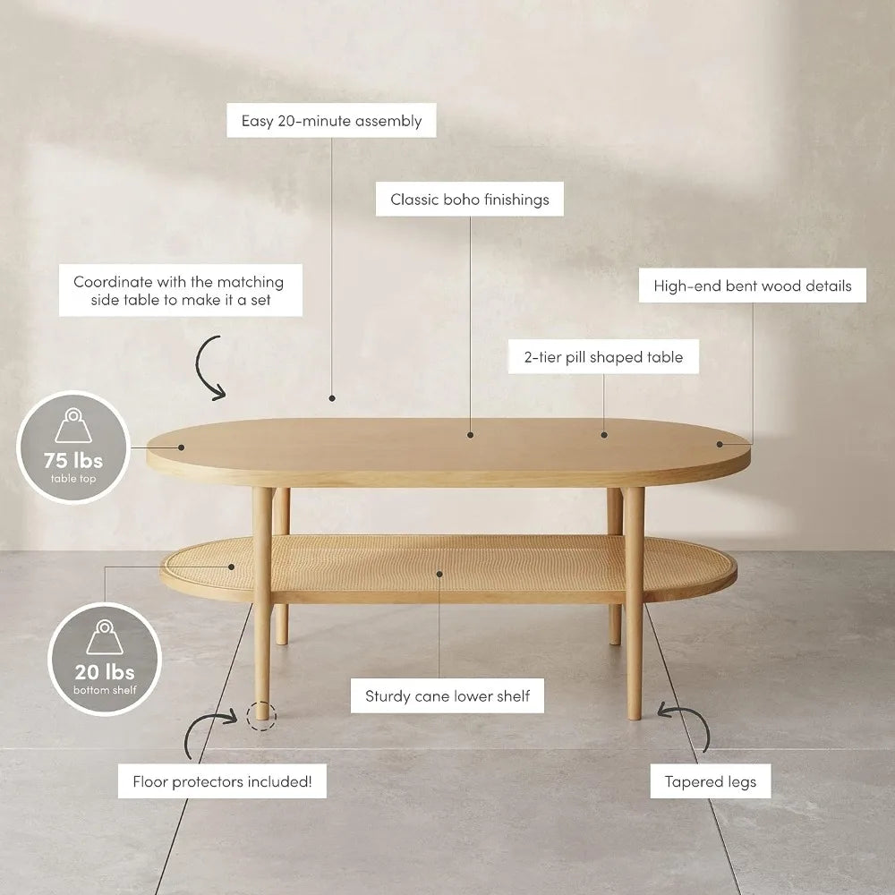 James Sonia Coffee Table with Storage Shelf, Light Wood/Rattan