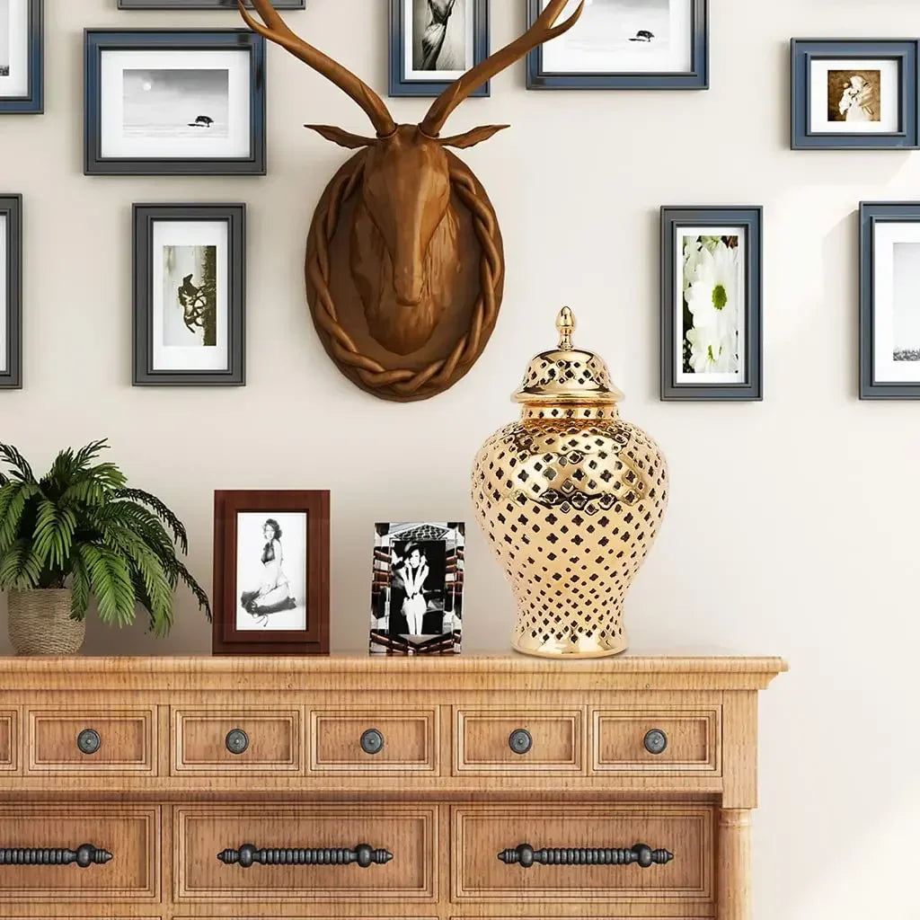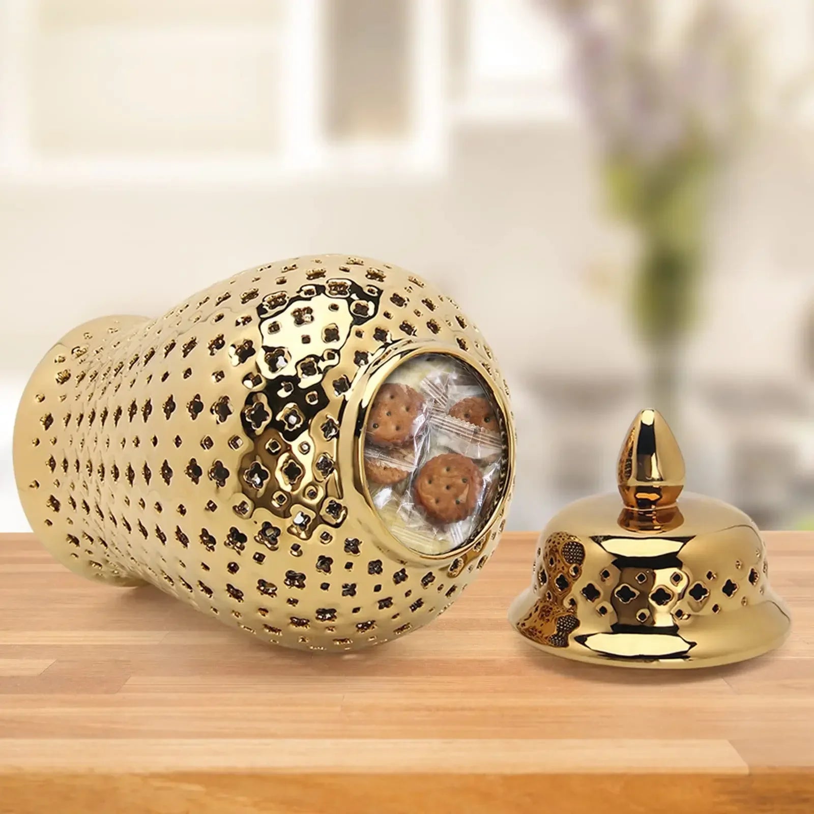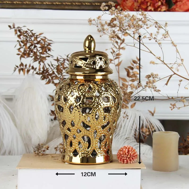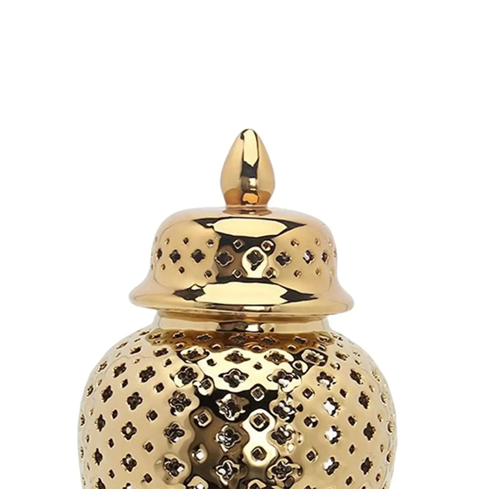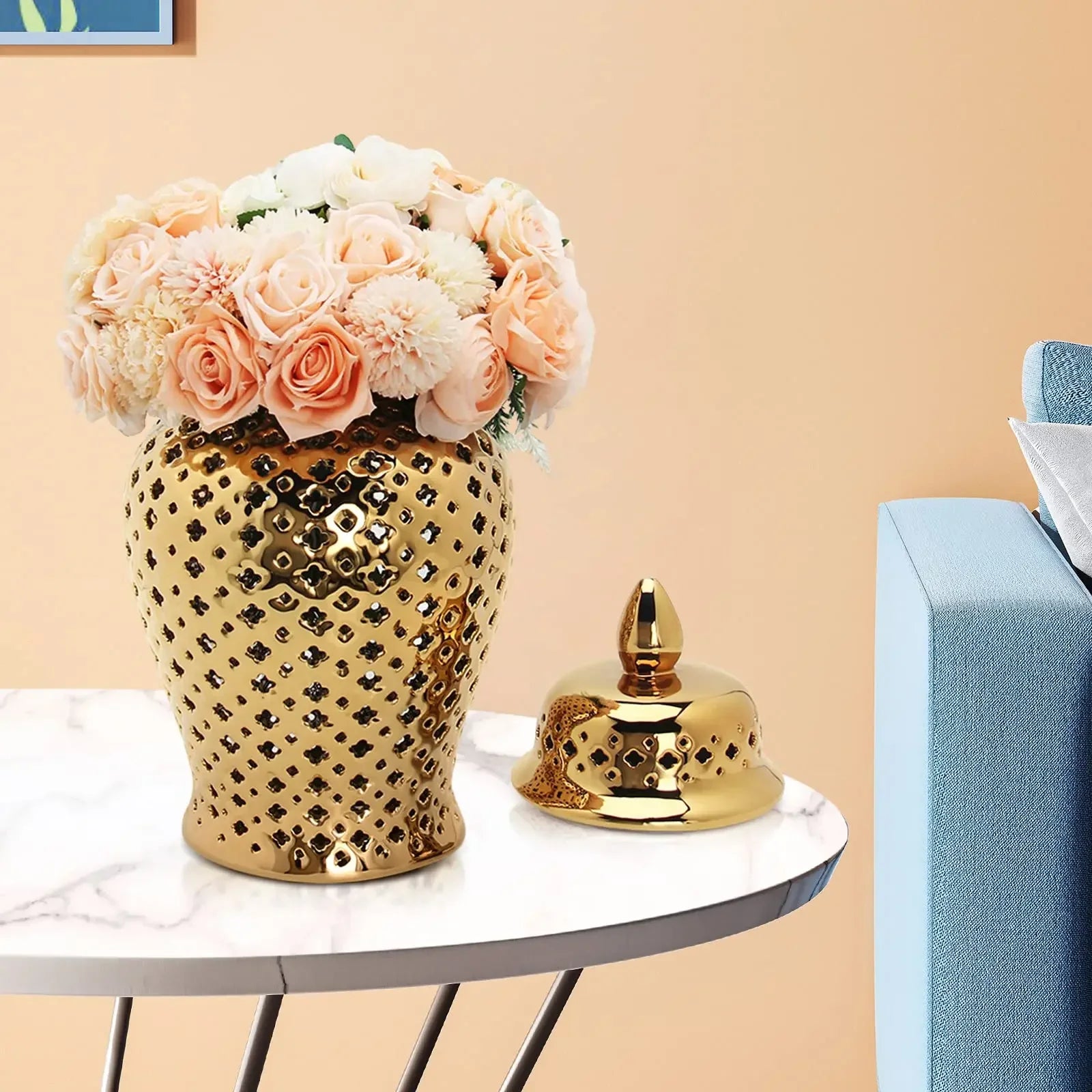 Pierced Gold Ceramic Vase Ginger Jar with Lid Hollow Out Storage Jar Bud Vase Carved Lattice Temple Jar for Room Home Decorative