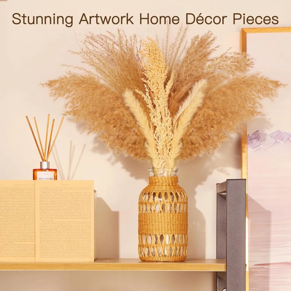 Rustic Farmhouse Vase, Hand Woven Boho Glass Vase for Home Decor, Artistic Decorative Dried Pampas Flower Vases for Bookshlef