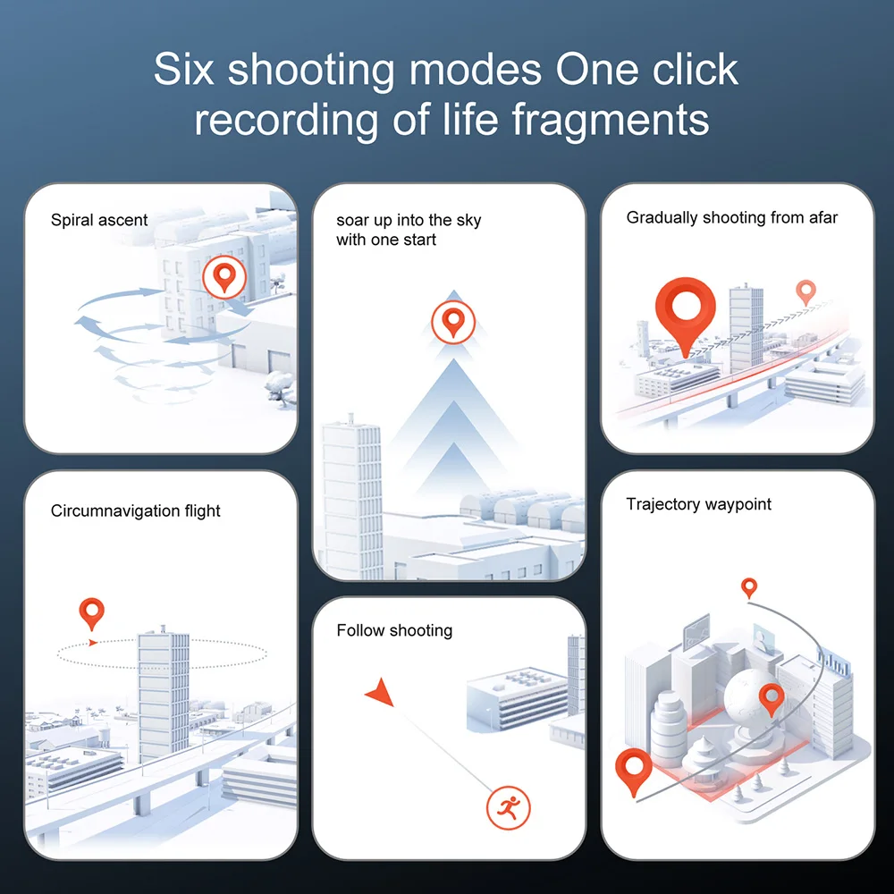 Connect WIFI system features: photo, video and real-time transmission, emergency stop, trajectory flight, one key surround, intelligent follow, add music, screen rotation, display aircraft location