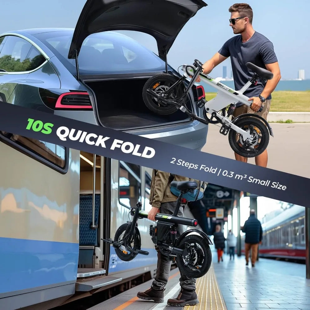 【Smart Uphill】- A 14 inch ebike doesn't have to be this nimble, but it is. Our 750W peak motor, seamlessly integrates intelligent algorithms. Effortlessly conquer inclines with automatic recognition and tailored assistance. Experience a breezy 15° uphill journey, complemented by a top speed of 20mph【Energy Saving Battery】- The 36V 7.8Ah replaceable battery completely hidden inside the ebike frame for protection. 2X fast charge in 3-4 hours to power your ride for up to 25 miles (pedal assist mode)【Excellent Portability】- With foldable handlebars, pedals, and a height-adjustable seat, the U1 small electric bike is designed for minimal storage space (<0.15m³). Whether fitting in a car trunk, navigating elevators, or keeping your apartment uncluttered, it's your ideal first ebike【Safe Riding】- Our electric bicycles are certified to the strict standards of UL2849 and CFR1512. Dual disc brakes provide ALL weather stopping power, front and rear lights enhance visibility, promoting safer rides day or night【Variable Ride】- Choose between pure electric mode, pedal assist mode, and normal bike mode. Our U1 electric bike offer 3 levels assist speeds to keep you flowing through trafficDue to package size restrictions, orders with multiple items (ebikes, accessories, etc.) will be sent separately