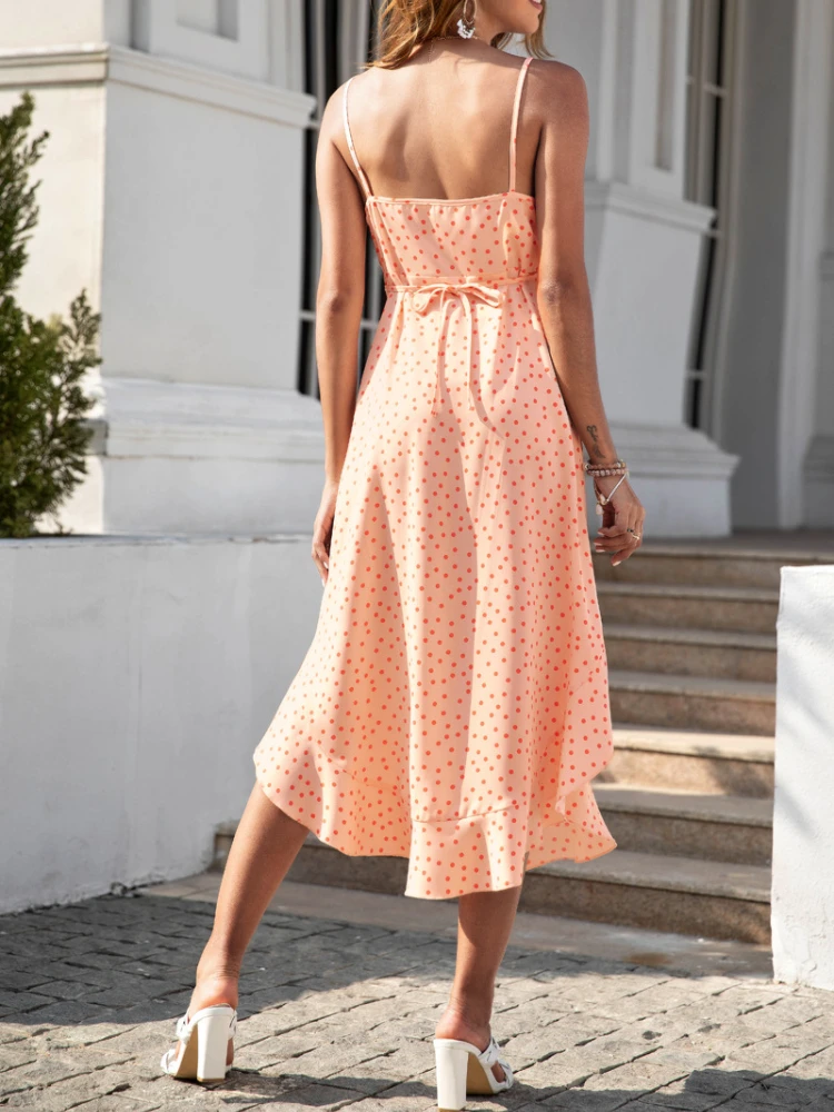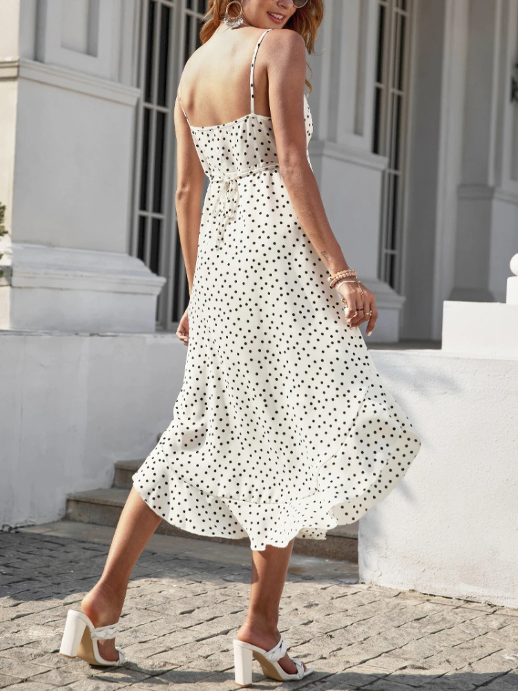 Women Camisole Dresses Fashion Polka Dot Print Spaghetti Strap Midi Sundress Summer Beach Party V-Neck Sleeveless Vestidos Femme