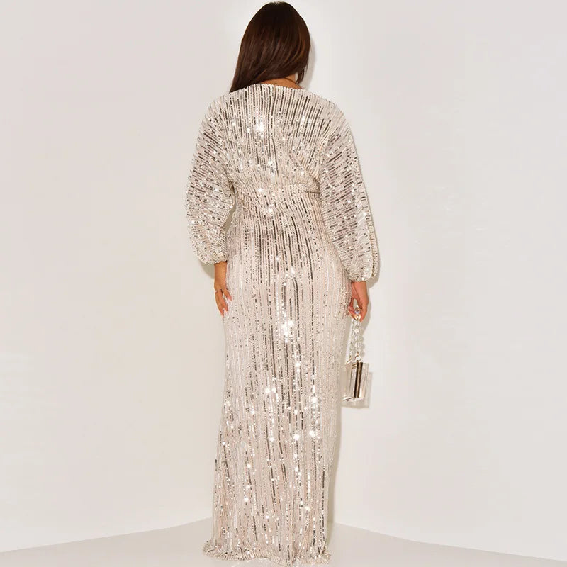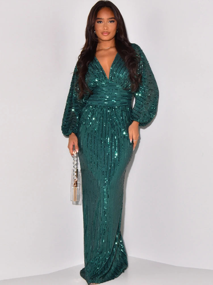 Women Sequins Splice Dress V Neck Full Sleeve A Line Evening Dresses Party Solid High Waist Long Skirts Office Lady Prom